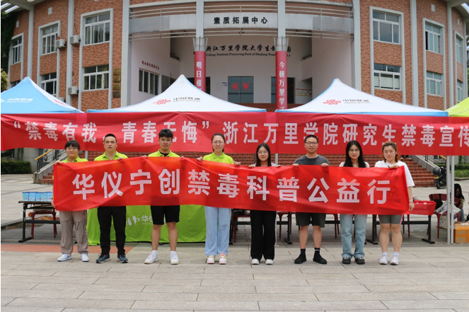 活動(dòng)結(jié)束后,華儀寧創(chuàng)禁毒科普公益小分隊(duì)與浙江萬里學(xué)院的志愿者們進(jìn)行合影留念。