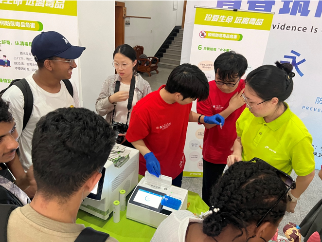 華儀寧創禁毒科普公益小分隊在現場組織開展了毒品模型講解、禁毒知識有獎問答、禁毒儀器設備實操體驗等活動,吸引了大量留學生體驗毛發毒品檢測,現場氛圍十分活躍。