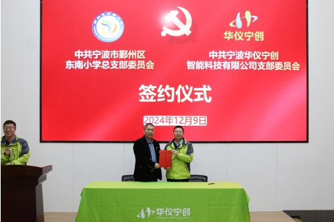 為深入貫徹黨的二十大精神,推動雙方在科技教育、人才培養、社會服務等方面的深度合作。2024年12月9日,中共寧波華儀寧創智能科技有限公司黨支部(以下簡稱華儀寧創黨支部)與中共寧波市鄞州區東南小學黨支部(以下簡稱東南小學黨支部)在華儀寧創報告廳舉行了黨建聯建簽約儀式。東南小學黨支部黨總支書記謝增煥、黨支部書記鮑期峰、黨支部書記繆潔及黨員代表、華儀寧創黨支部書記聞路紅,副書記范國正、委員劉云、馮建英及黨員代表參會。