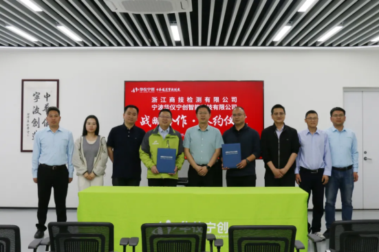 2025年4月10日下午,浙江商技檢測有限公司(以下簡稱“浙江商技檢測”)與寧波華儀寧創(chuàng)智能科技有限公司(以下簡稱“華儀寧創(chuàng)”)舉行戰(zhàn)略合作簽約儀式。出席本次簽約儀式的有:寧波市市場監(jiān)督管理局食品安全協(xié)調(diào)處副處長鄭睿行、浙江商技檢測黨支部書記、董事長兼總經(jīng)理瞿煒峰、副總經(jīng)理張達、華儀寧創(chuàng)總經(jīng)理聞路紅、副總經(jīng)理甘劍勤以及合作雙方相關(guān)部門的負(fù)責(zé)人。