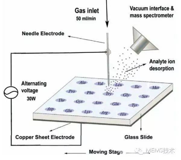 DBDI的設計:中空不銹鋼針(長20mm,內徑0.2mm)為放電電極之一,中間通氦氣、氬氣或者其它氣體(流速12-48m/s);銅片(25 mm ×75 mm)作為另一個電極,黏附在作為絕緣體的玻片背面(25.4 mm × 76.2mm ×1.2 mm),玻片也作為樣品平臺安裝在三維移動工作臺上。電極尖端和玻片表面的距離為5-10mm。當兩個電極施加電壓為3500-4500V、頻率為20.3kHz的交流電時,在玻片和不銹鋼電極尖端之間形成穩定的等離子體,玻片表面的樣品被等離子體解吸附離子化后引入質譜儀進行分析測定。