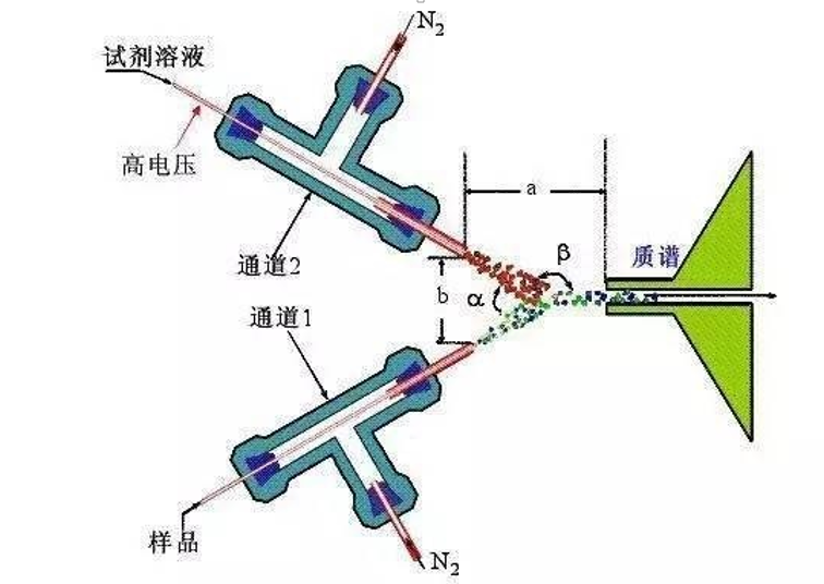 EESI的裝置由用于產生初級離子的電噴霧通道和用于樣品引入的樣品通道組成,如圖所示。