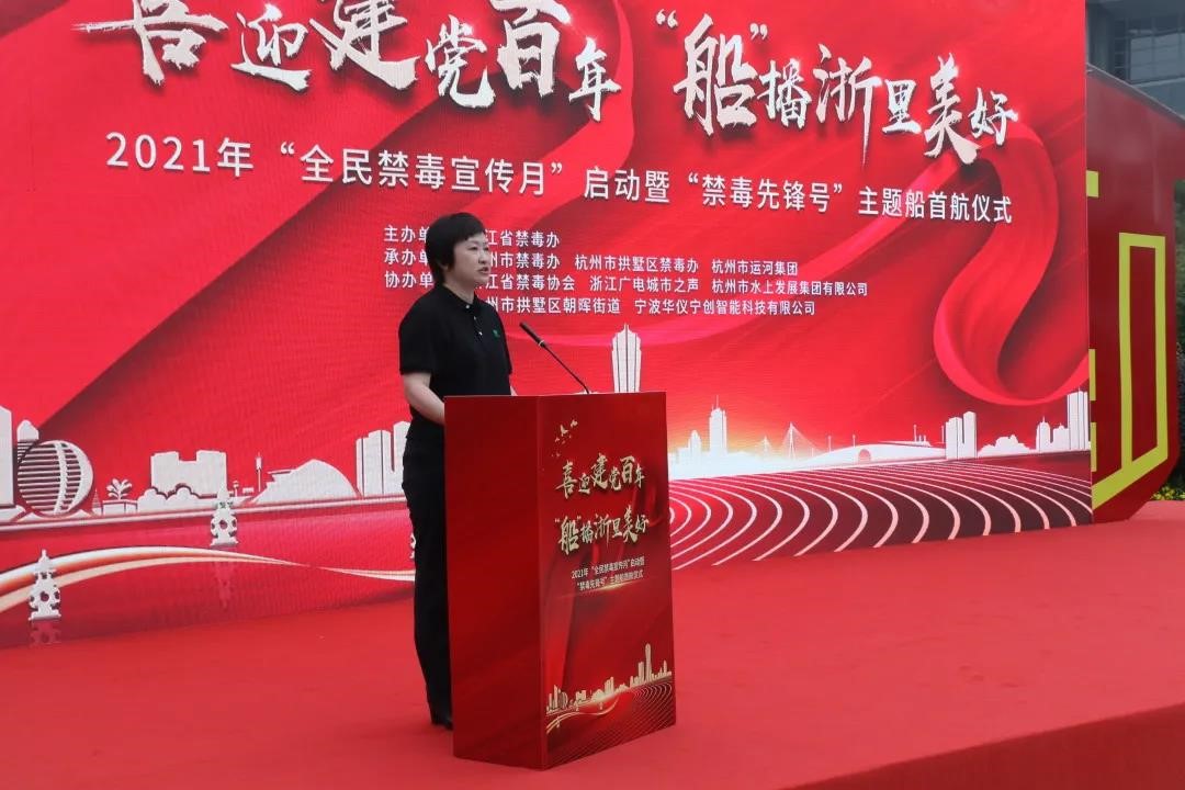 6月2日上午,由浙江省禁毒辦主辦,杭州市禁毒辦、杭州市拱墅區禁毒辦、杭州市運河集團承辦,浙江省禁毒協會等單位協辦的2021年浙江省“全民禁毒宣傳月”啟動暨“禁毒先鋒號”主題船首航儀式活動在杭州西湖文化廣場舉行。浙江省禁毒委副主任、公安廳副廳長劉靜,省禁毒委委員、省婦聯副主席童麗君,省禁毒辦常務副主任、公安廳禁毒總隊總隊長陳斌等領導和來自全省的禁毒民警代表、禁毒講師代表、志愿者代表等300余人參加了本次活動。
