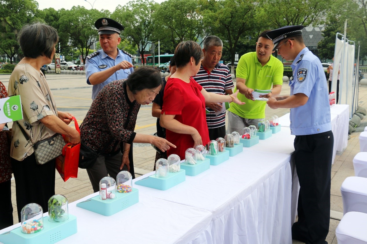 6月24日上午,在鄞州區(qū)明州里商場門前,一場題為“共建無毒家園,守護(hù)紅色根脈”的禁毒科普公益行活動熱烈展開。本次活動由鄞州區(qū)禁毒委員會辦公室、鄞州區(qū)科學(xué)技術(shù)協(xié)會、鐘公廟街道、寧波海警局鄞州工作站、寧波華儀寧創(chuàng)智能科技有限公司等單位聯(lián)合舉辦,包括仿真毒品展示、禁毒常識宣講、海上緝毒分享、禁毒知識有獎問答、禁毒檢測儀器體驗等多個豐富多彩的內(nèi)容。鄞州區(qū)禁毒辦常務(wù)副主任、區(qū)公安分局禁毒大隊大隊長葉仁達(dá)、鄞州區(qū)公安分局禁毒大隊教導(dǎo)員林蕓、寧波海警局鄞州工作站教導(dǎo)員朱文陸、鐘公廟街道社會治安綜合治理辦公室主任、街道禁毒辦主任沈衛(wèi)民、寧波華儀寧創(chuàng)智能科技有限公司總經(jīng)理聞路紅等領(lǐng)導(dǎo)以及警民代表300余人參加了現(xiàn)場活動。