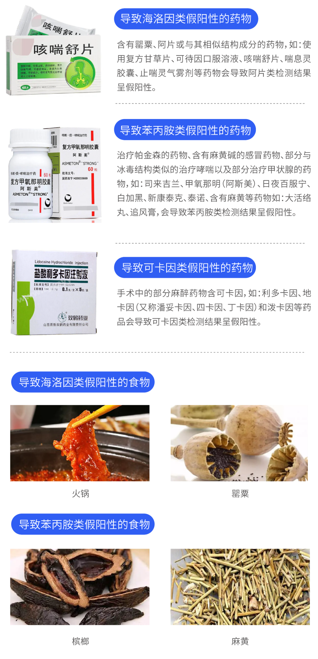 攝入不法分子添加罌粟殼等違禁物質的食物;一些藥物或食物中的某些物質,其化學結構或代謝物的核心結構與毒品結構相同或類似,直接影響快速篩查結果。