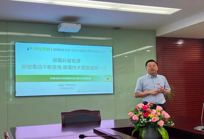 華儀寧創(chuàng)黨支部書記聞路紅詳細介紹了黨支部情況和黨支部榮獲寧波市“五星級基層黨組織”、鄞州區(qū)“鄞領(lǐng)雙強”黨支部、鄞州區(qū)“青年文明號”等榮譽歷程。接著開展了《新型毒品不斷變身,禁毒技術(shù)更要道高一丈》的禁毒黨課,主要介紹了毒品的演變歷史、毒品的危害、如拒毒防毒以及在黨建引領(lǐng)下華儀寧創(chuàng)在禁毒科技創(chuàng)新領(lǐng)域取得的優(yōu)異成績,已研發(fā)推出了毛發(fā)毒品快速篩查質(zhì)譜儀、手機APP驗毒、毒品防控移動實驗室、污水毒品現(xiàn)場快速檢測車等20多項全面覆蓋禁毒工作的自主創(chuàng)新產(chǎn)品和在禁毒實戰(zhàn)工作中取得的顯著成效。
